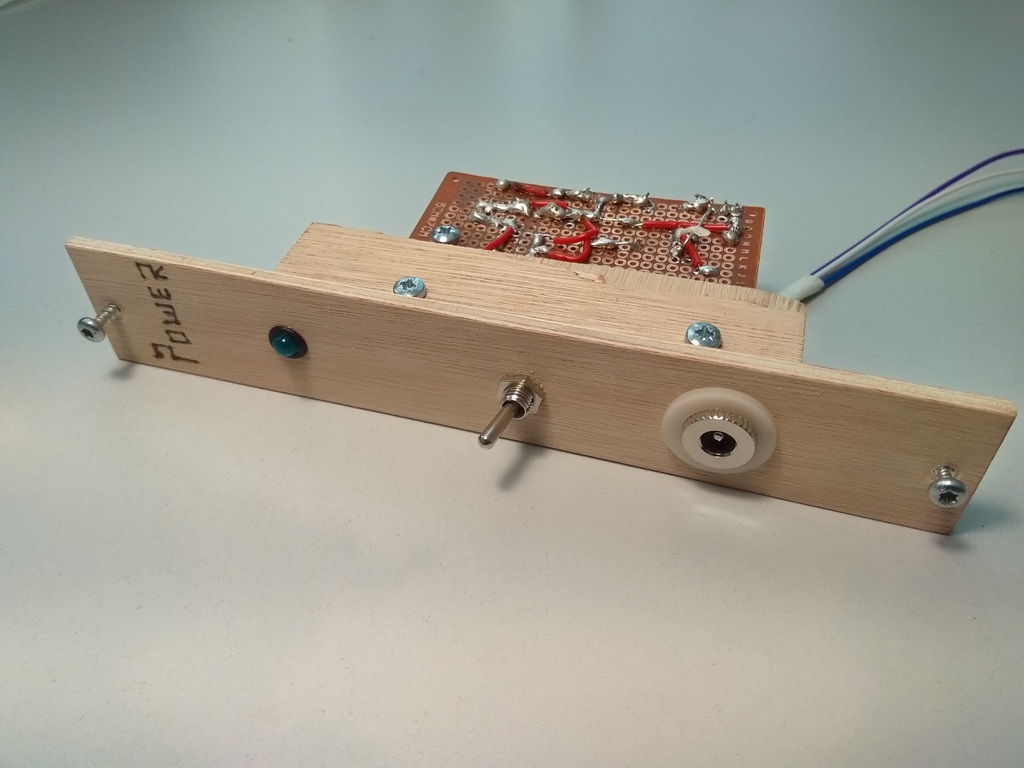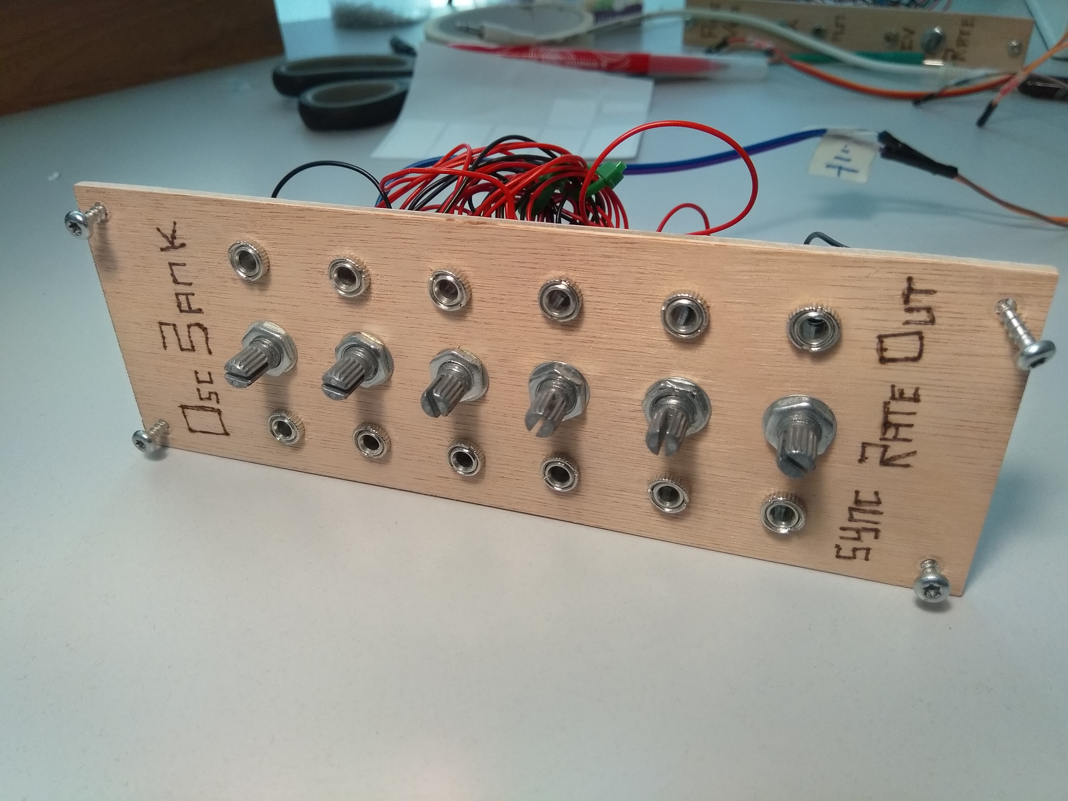 For this project I made a wooden box with enough space to put enough modules in. The frontpanels are made from 4mm multiplex, it's cheap and easy to work with I think. I just used my soldeer tip to burn the names and labels on the panels :)