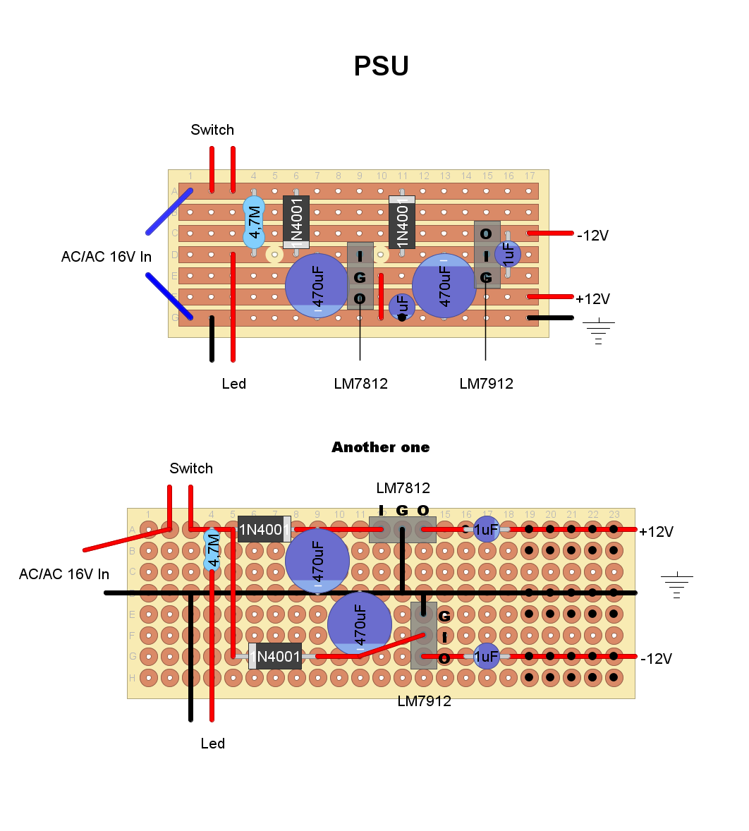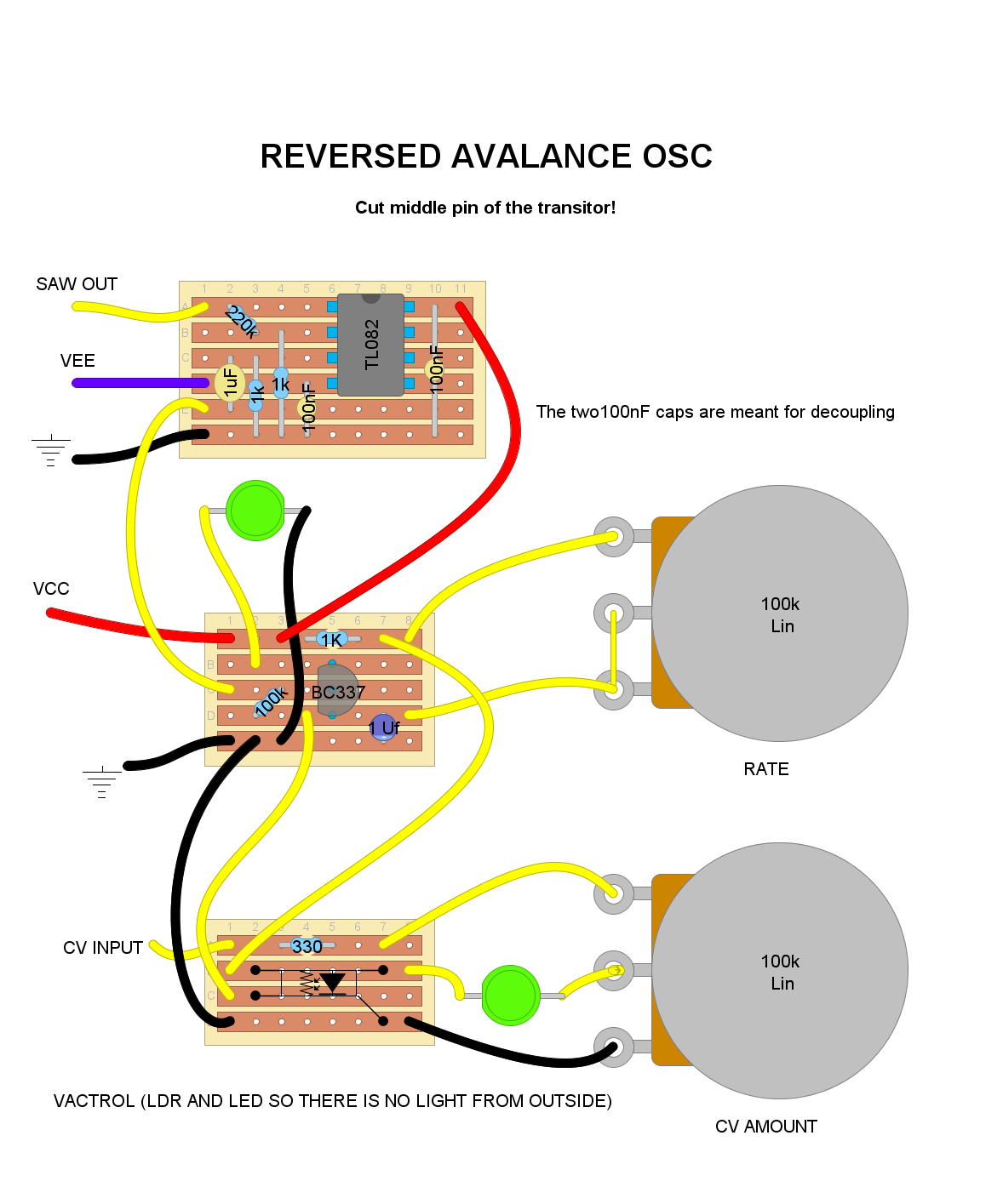 Here are the veroboard designs I made so far for this modular synth project which seem to work fine.