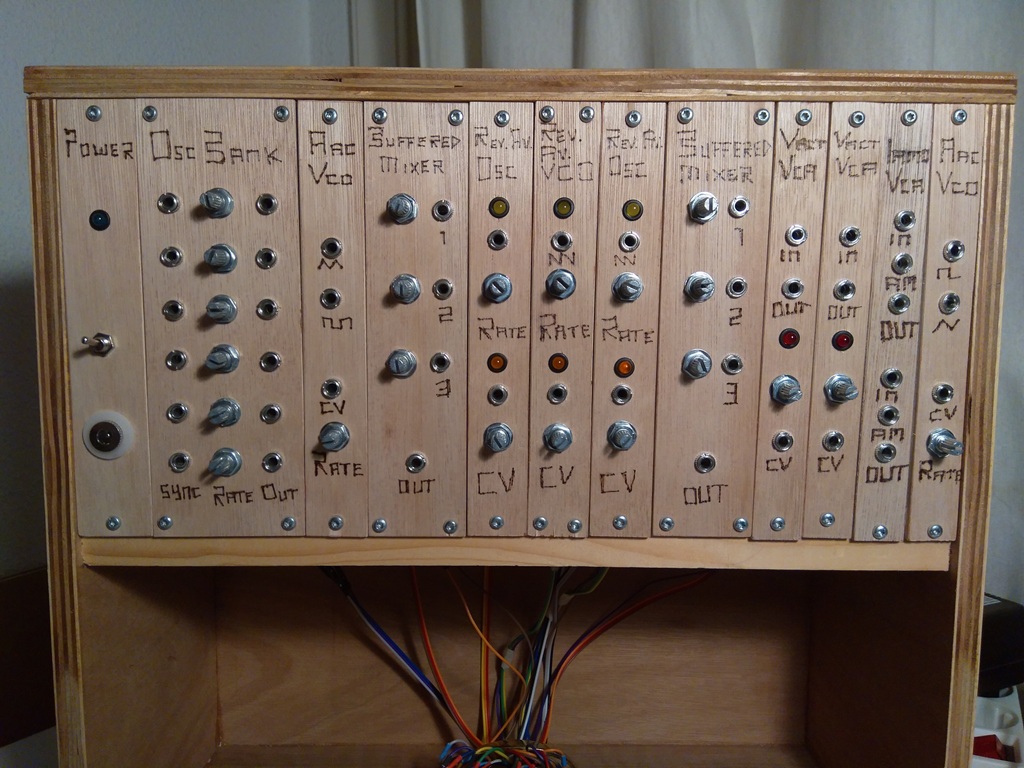 For this project I made a wooden box with enough space to put enough modules in. The frontpanels are made from 4mm multiplex, it's cheap and easy to work with I think. I just used my soldeer tip to burn the names and labels on the panels :)